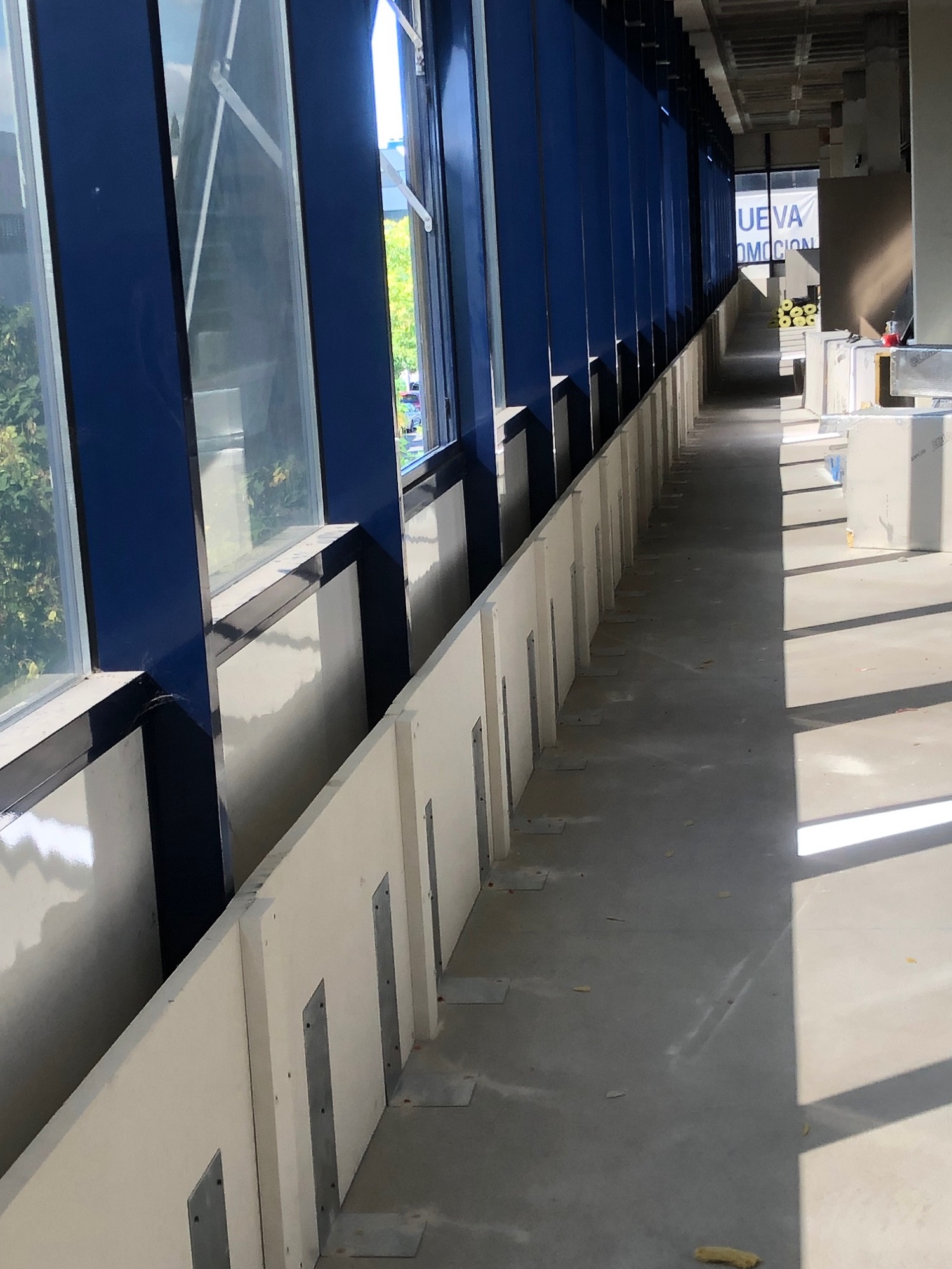 Las fachadas adosadas presentan graves problemas en caso de incendio, ya que el fuego puede transmitirse a través de los huecos de muro cortina-forjado y muro cortina-medianería.